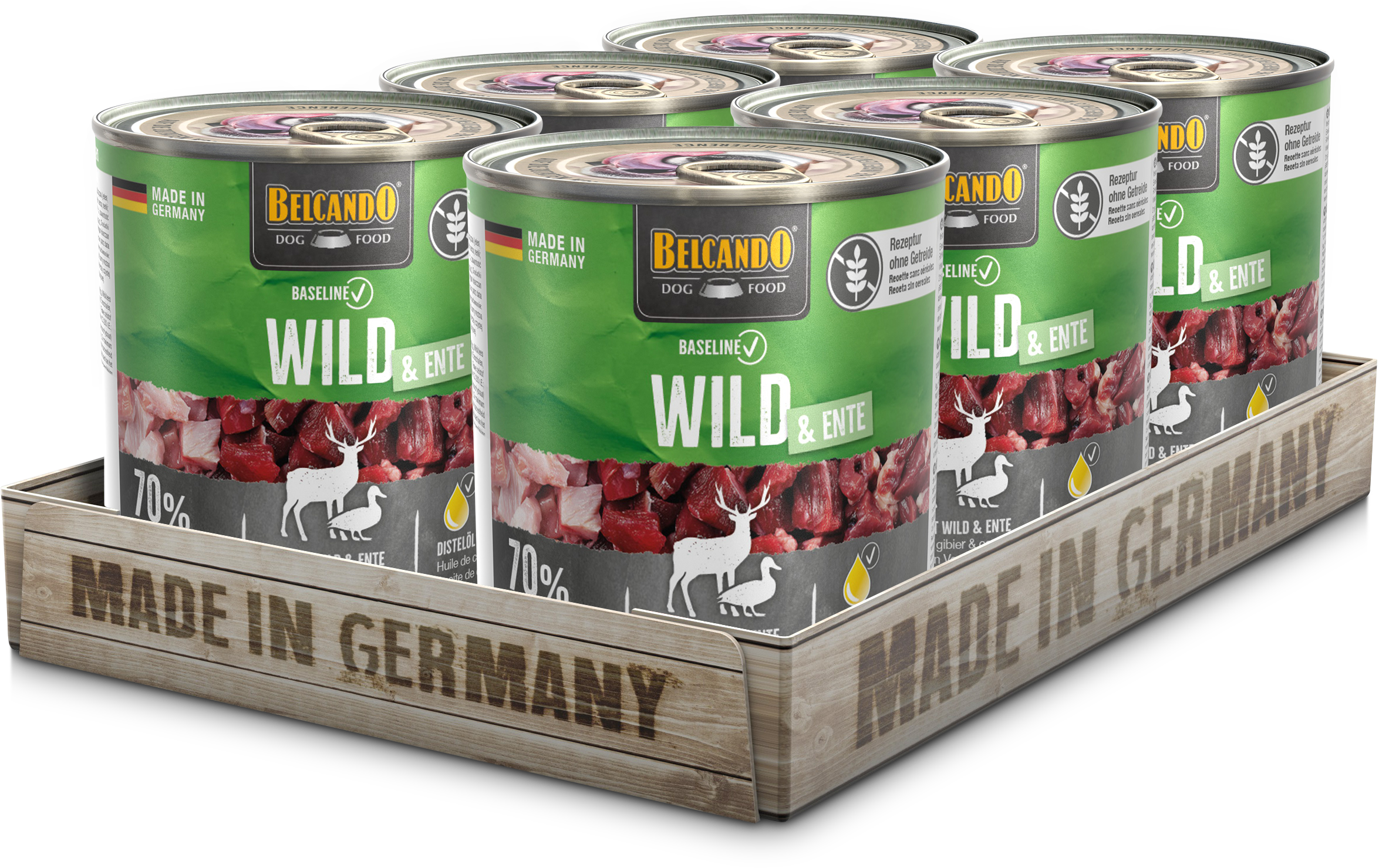 Zusammensetzung: Wildfleisch (Hirsch, Wildschwein) (13 %); Entenfleisch (13 %); Fleischbrühe (28,8 %); Fleisch; Leber; Magen; Herz; Niere; Lunge; Eierschalen, getrocknet; Mineralstoffe; Distelöl (0,2 %)Analyse: Protein 11 %; Fettgehalt 5,5 %; Rohasche 2,2 %; Rohfaser 0,3 %; Feuchtigkeit 79 %Zusatzstoffe je Kg:Ernährungsphysiologische Zusatzstoffe: Vitamin D3 200 I.E.; Vitamin E (als all rac-alpha-Tocopherylacetat) 50 mg; Mangan (als Mangan(II)-sulfat, Monohydrat) 2 mg; Zink (als Zinksulfat-Monohydrat) 20 mg; Jod (als Kalziumjodat, wasserfrei) 0,2 mgFütterungsempfehlung: Durchschnittswerte für die Fütterung von ausgewachsenen, normal aktiven Hunden finden Sie auf der Verpackung bzw. im Prospekt aufgeführt. Frisches Trinkwasser sollte immer zur freien Verfügung stehen. Nach dem Öffnen max. 24 Stunden im Kühlschrank aufbewahren.Artikel: 512445 -
