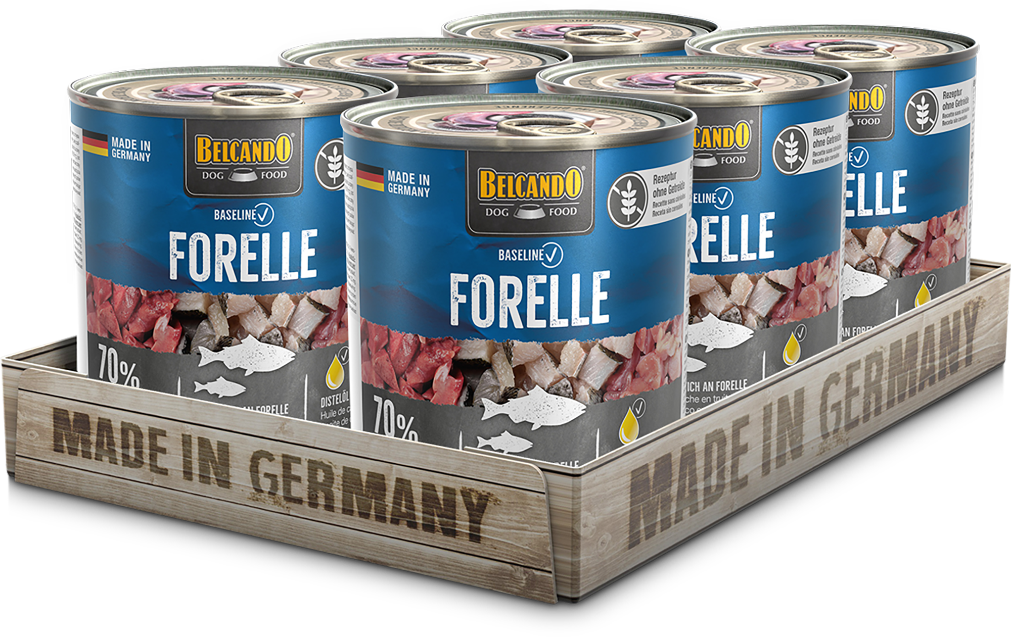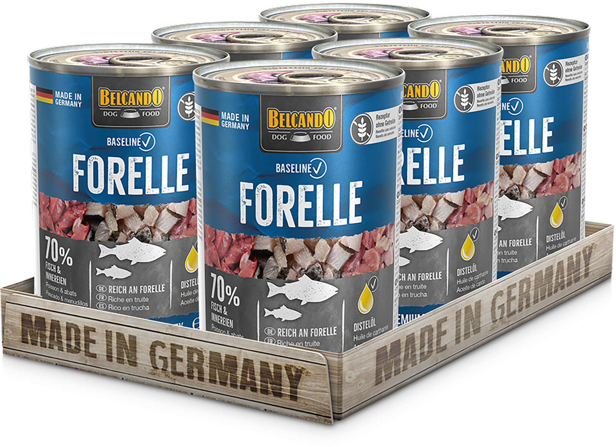 Zusammensetzung: Forelle (26 %); Fleischbrühe (28,8 %); Leber; Magen; Herz; Niere; Lunge; Eierschalen, getrocknet; Mineralstoffe; Distelöl (0,2 %)Analyse: Protein 11 %; Fettgehalt 6 %; Rohasche 2 %; Rohfaser 0,3 %; Feuchtigkeit 79 %Zusatzstoffe je Kg: Ernährungsphysiologische Zusatzstoffe: Vitamin D3 200 I.E.; Vitamin E (als all rac-alpha-Tocopherylacetat) 50 mg; Mangan (als Mangan(II)-sulfat, Monohydrat) 2 mg; Zink (als Zinksulfat-Monohydrat) 20 mg; Jod (als Kalziumjodat, wasserfrei) 0,2 mgFütterungsempfehlung: Durchschnittswerte für die Fütterung von ausgewachsenen, normal aktiven Hunden finden Sie auf der Verpackung bzw. im Prospekt aufgeführt. Frisches Trinkwasser sollte immer zur freien Verfügung stehen. Nach dem Öffnen max. 24 Stunden im Kühlschrank aufbewahren.Artikel: 513455